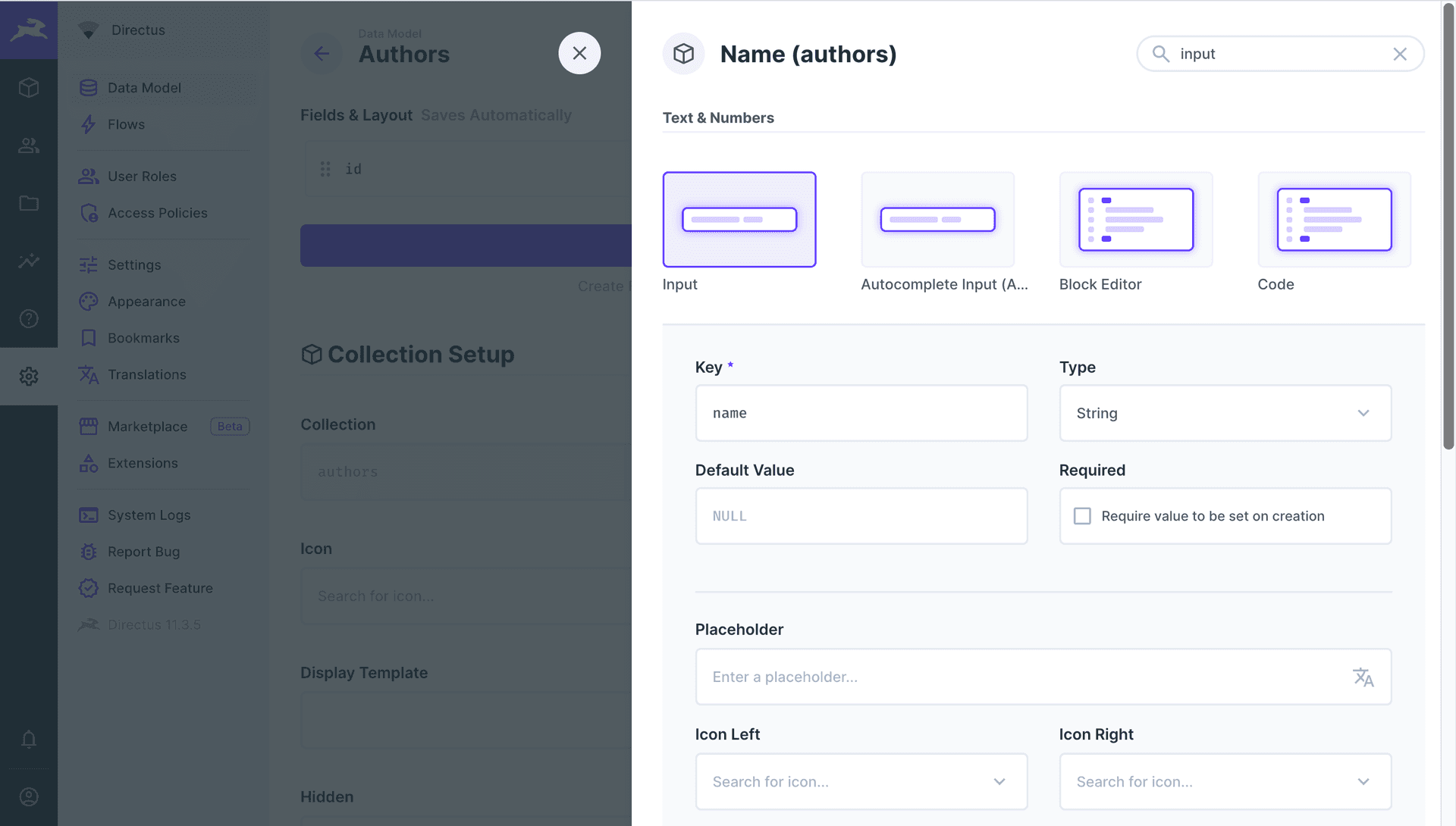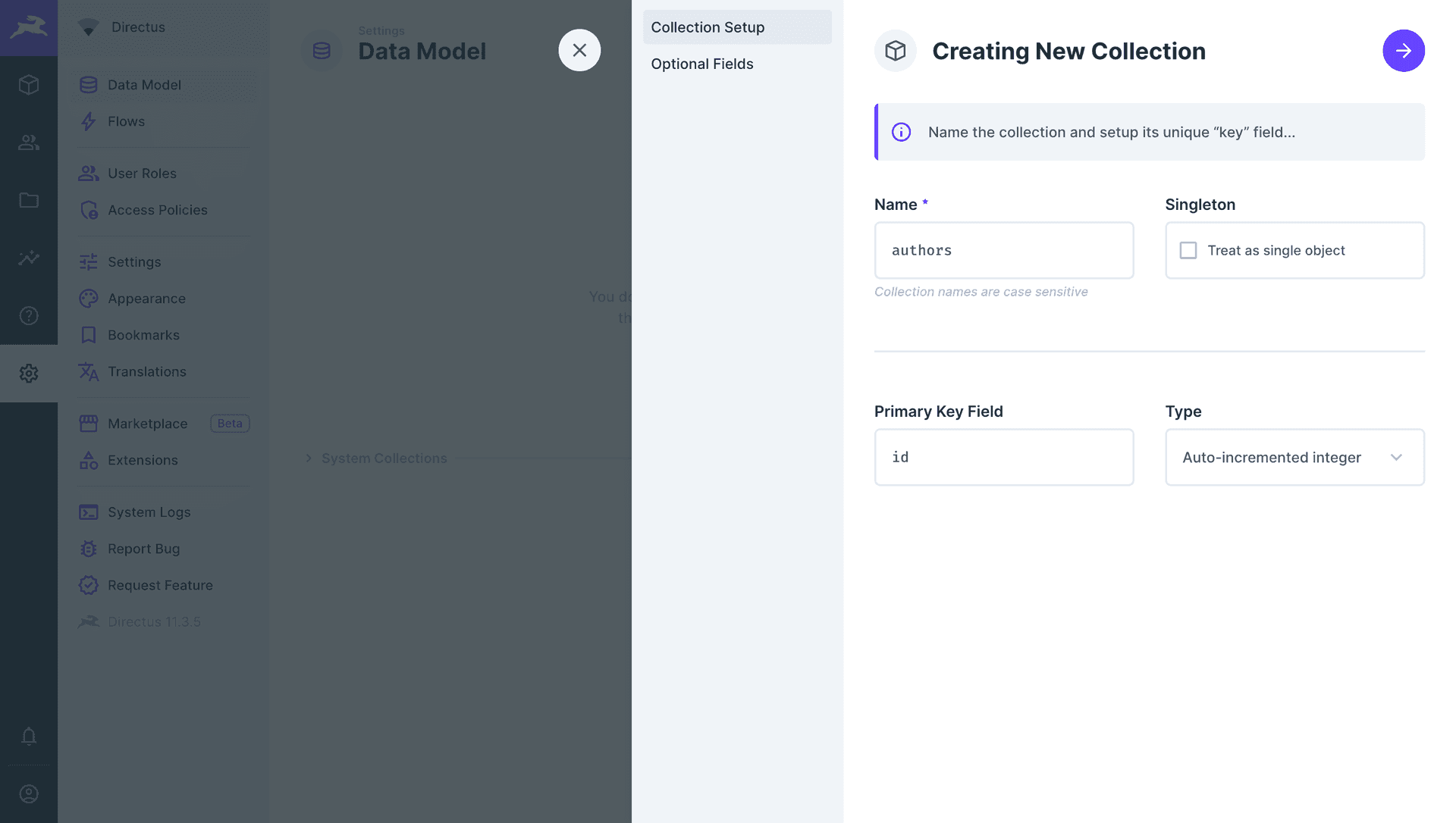 Set the Name field to authors, press the next arrow icon, and save by clicking the tick icon.