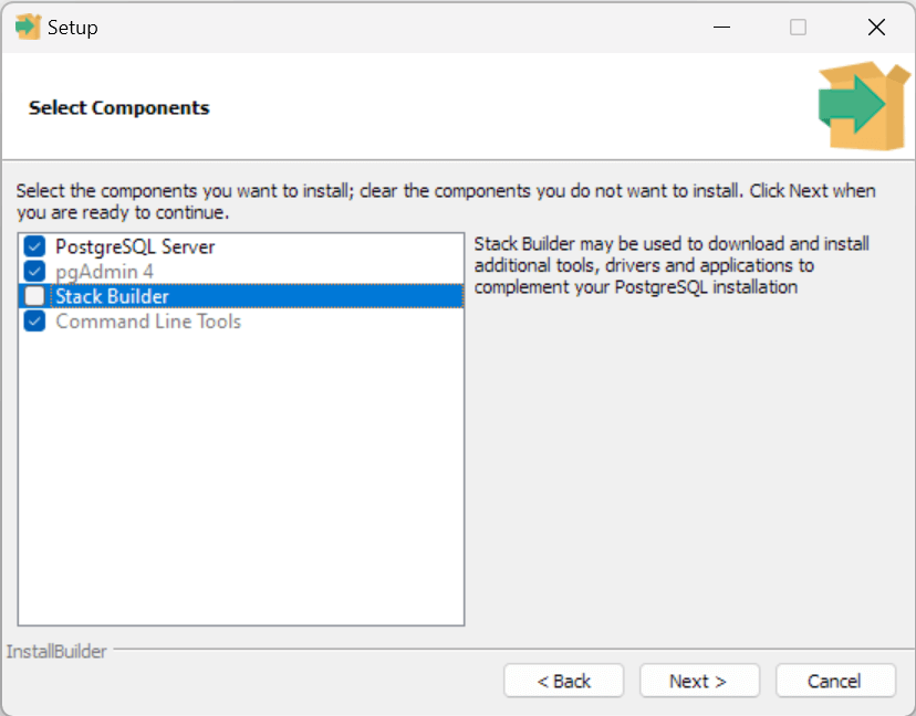- **Stack Builder** provides a GUI that allows you to download and install drivers that work with PostgreSQL.